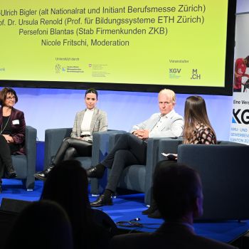 Auch zur 20. Eröffnung der Berufsmesse begrüsste die Bildungsdirektorin Silvia Steiner die Anwesenden mit einigen Worten. «Zum zehnten Mal darf ich nun hier stehen, was mich sehr freut.» Im Referat von Prof. Dr. Ursula Renold wurden zentrale Entwicklungen der Berufsbildung sowie deren Bedeutung und Auswirkungen aufgezeigt. In einer Podiumsdiskussion mit Prof. Dr. Ursula Renold, Hans-Ulrich Bigler (Aalt Nationalrat und Initiant der Messe) sowie Persefoni Blantas (Stab Firmenkunden ZKB) wurde dies sowie die persönliche Bedeutung der Berufsmesse diskutiert.